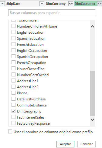 En nuestro caso, hemos querido volver a seleccionar DimCustomer, para poder expandir otras columnas de DimCustomer, además de DimGeography. Esta acción sería innecesaria si desde el inicio seleccionamos todas las columnas y tablas relacionadas. El paso extra lo he provocado, sobre todo para que veamos que expandir no es dejar todo lo que hay y agregar más, hay que tener cuidado.