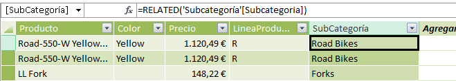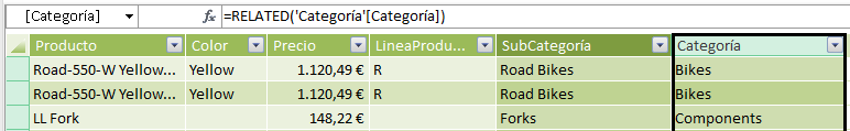 Con PowerPivot necesitamos aplicar el lenguaje de expresiones DAX, necesitamos entender que la función RELATED() nos permite traer una columna de una tabla relacionada, aunque la relación no sea directa, como en este caso con Categoría.