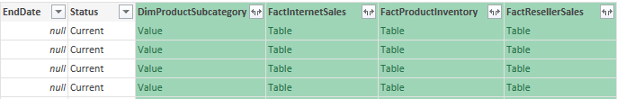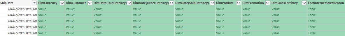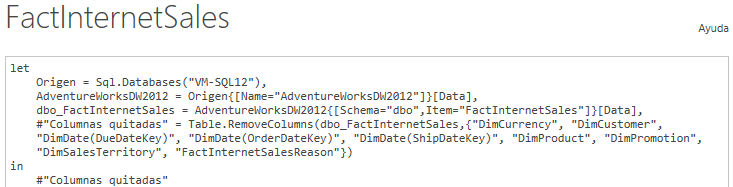 Tenemos el Editor de consultas de Power Query con la tabla FactInternetSales de la base de datos AdventureWorksDW2012 que se corresponde con el ejemplo de Microsoft. Esta tabla contiene los hechos de las ventas y como ya sabemos, contiene también el acceso directo a todas las columnas de todas las tablas relacionadas.