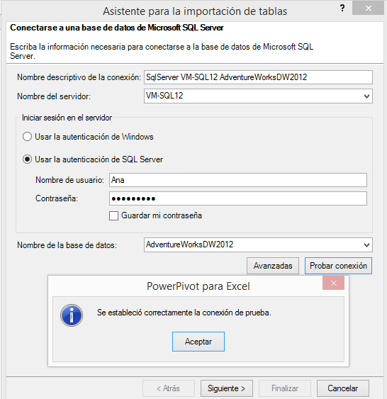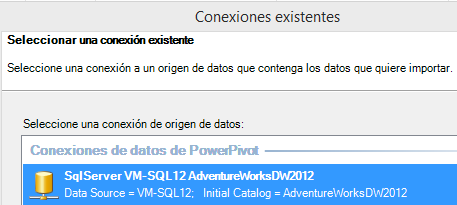 Por su parte, Power Pivot al conectar no nos pide solamente el servidor, sino que necesita también autenticar, una y otra vez, así como el catálogo o Base de datos, es decir, no hay forma de reutilizar la conexión para trabajar con diferentes Bases de datos alojadas en el mismo servidor.