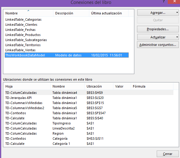 Veamos las conexiones que hay en este libro para confirmar que no hay Base de datos alguna ni datos externos, porque el objetivo es centrarnos en el modelo, hayan venido de donde hayan venido los datos.