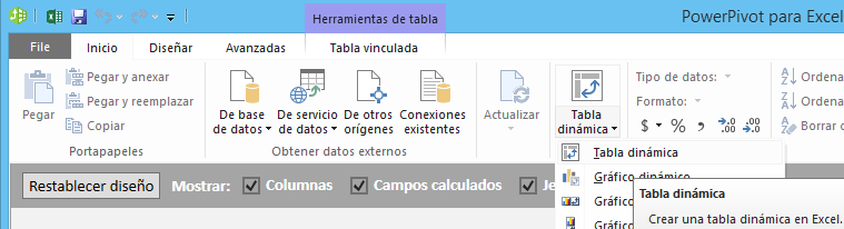 Entonces, desde el Modelo Power Pivot, ficha Inicio, comando Tabla dinámica tenemos la posibilidad de crear una tabla dinámica en una hoja existente o en una hoja nueva de este libro Excel.