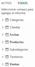 De la lista de campos de tabla dinámica, tenemos dos fichas, por una parte, Todos lista todas las tablas y campos disponibles: