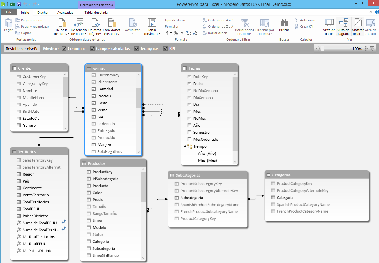 Para dejar un ejemplo de qué son estas aplicaciones clientes y cómo visualizan el modelo analítico creado con Power Pivot, he creado un fichero Excel, con unas tablas que contienen 7 tablas que se corresponden a los contenidos de las tablas FactInternetSales, DimCustomer, DimDate, Dimproduct, DimCategory, DimSubcategory y DimTerritorySales de la Base de datos AdventureWorksDW2012. Los nombres de las tablas y muchos de los nombres de las columnas han sido traducidos, para quitar complejidad.