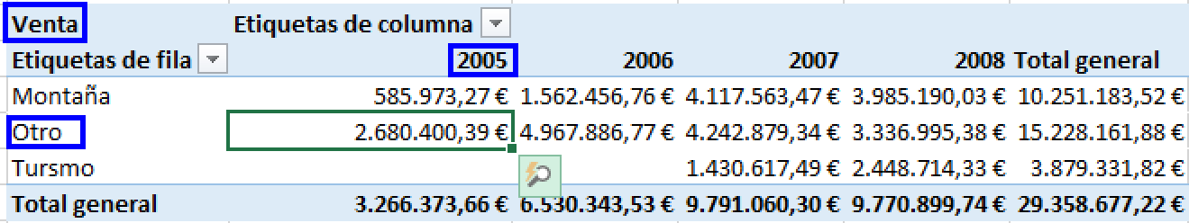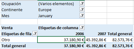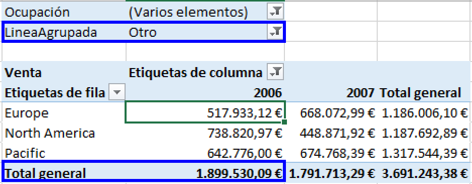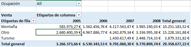 Aquí, y por primera vez, el total general ha dejado de ser 29 millones. Está afectado por el campo que hemos agregado al área filtro de la tabla dinámica.
