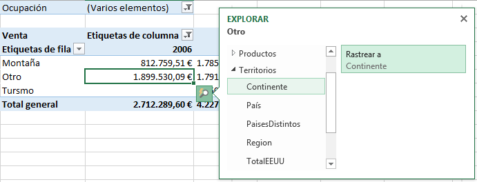 Entonces, vamos a explorar más en detalle, el valor (1.899.530,09 €) de Ventas de la LíneaAgrupada igual a Otro para el Año 2006 y lo vamos a rastrear por los valores de la columna o campo Continente de la tabla Territorios.