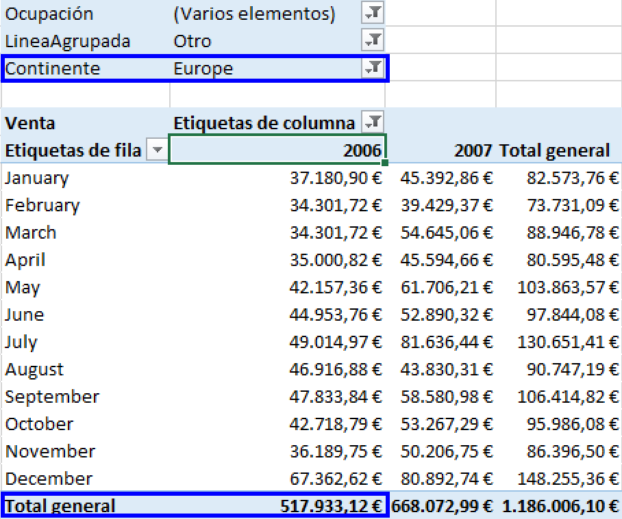 Como resultado, se muestra el Continente = Europa agregado a los filtros y los meses agregados a las filas de la tabla dinámica. En el total, poco más de medio millón de euros.