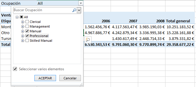 En este caso vamos a filtrar por la cabecera de columna Año, correspondiente a la tabla Fechas. Las opciones de filtrado son mucho más elaboradas que antes, tanto por etiqueta como por valor, además de ofrecer opciones de búsqueda.