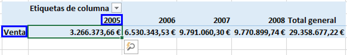 El total sigue siendo 29 millones, lo que pudiera indicar que no hay filtro; pero para cada una de las celdas que muestran el valor de cada año, en realidad sí que hay un filtro que está compuesto por el campo Ventas y el campo Año.