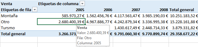 Ocurre lo mismo, el total general sigue siendo 29 millones; pero cada celda refleja el resultado de la evaluación de tres elementos, el campo de valor, el campo de fila y el campo de columna.