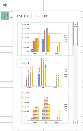 A la derecha del gráfico vemos dos botones que son parte de las Novedades de MS Excel 2013, la función de ambos es incrementar la productividad en la creación y diseño de gráficos.