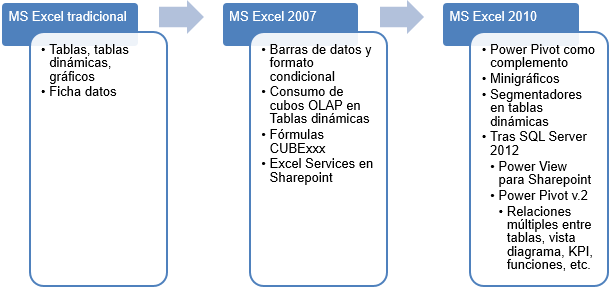 Excel ha sido una herramienta que se ha mantenido en constante evolución, si comparamos, también muy a groso modo, las capacidades que nos ha brindado para desarrollar nuestro trabajo dentro de BI son, entre otras :