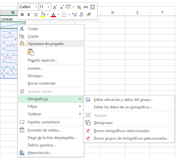 Además de la ficha Herramientas de Minigráficos, a la que regresaremos en la próxima entrada, no olvidar a nuestro amigo, el clic derecho del ratón, es decir al menú contextual de este objeto de Excel.