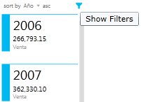 Además de los filtros aplicados por otros objetos, en Power View, a cada elemento se le pueden aplicar filtros de forma independiente. Al pasar el ratón por el objeto en cuestión se activa el botón para los filtros como se muestra en las imágenes correspondientes a tabla, matriz y tarjeta.