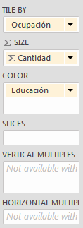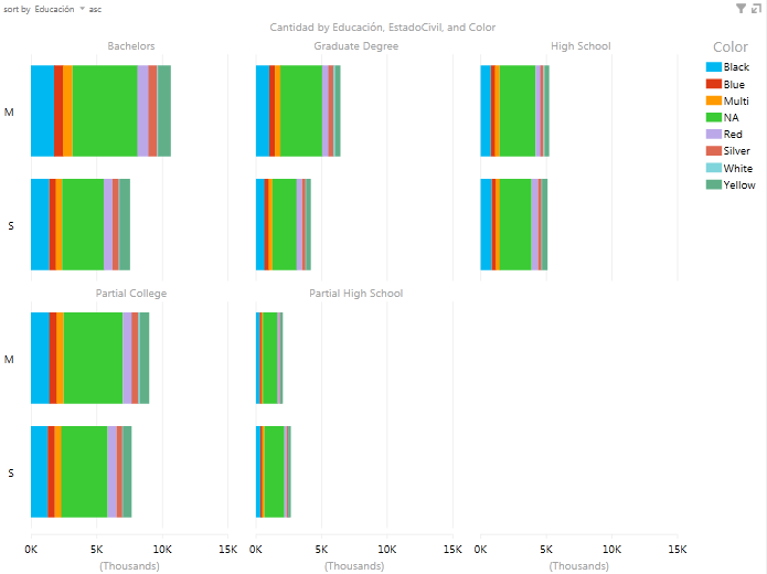 Digamos que queremos un múltiplo vertical, que muestre tantos gráficos como valores distintos existan en la columna Educación. En la siguiente imagen se ve el efecto del gráfico. Yo creo, que en dependencia del contexto en que se utilice, es una buena opción, ya que nos ofrece mucha información de muchos de los campos que están en el modelo. En este caso, además estamos combinando tres de las cuatro tablas de nuestro modelo, muy efectivo.