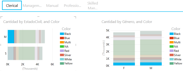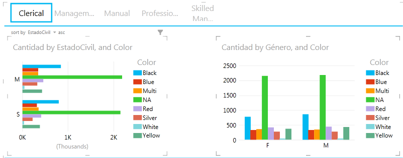 En la siguiente imagen se observa que si filtramos sobre el gráfico de barras de la izquierda por Estado Civil = M y Color = Black, el filtro se ve reflejado en el gráfico de columnas de la derecha. La parte que se observa resaltada en cada columna se corresponde con la parte de los valores con Color = Black, que pertenece al Estado Civil = M, dividido en ambas columna que representan los valores de Género.