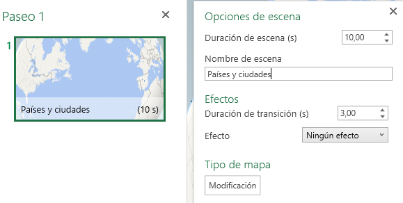 Ahora ya tenemos dos escenas en el paseo. Cada escena, como sabemos se puede configurar de forma independiente, en este caso, por ejemplo, modificamos el nombre y la duración de las escenas.