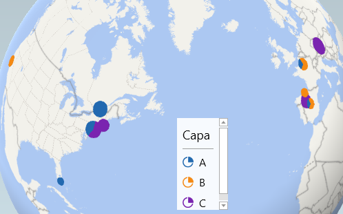 El tamaño de la burbuja depende del volumen de ventas y el ángulo de cada color en la burbuja, refleja el segmento correspondiente a cada categoría. En este caso, en el que hay apenas tres categorías, puede valer, aunque si tenemos muchos puntos en el mapa, pudieran solaparse y no facilitar el análisis.