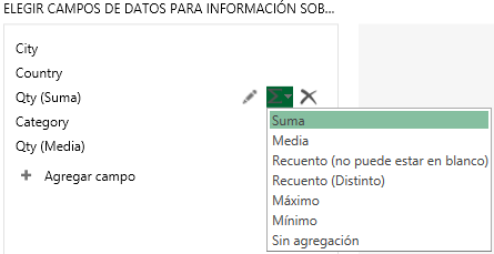 Desde el menú situado a la derecha de cada campo seleccionado, podemos definir la función de agregación a utilizar. Si expandimos un poco más, vemos que el valor dependerá del tipo de dato, si es continuo, dependerá de la función de agregado definida y los campos de valores discretos utilizan, de forma predeterminada la función Recuento.