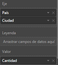 Como punto de partida tenemos un gráfico de Barras que muestra en su Eje, la jerarquía formada por País y Ciudad y en la propiedad valor el campo Cantidad.
