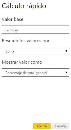 Hay una funcionalidad, que es el cálculo rápido. Aquí es donde yo creo que habrá más riqueza en futuras versiones. De momento lo que tenemos es Porciento sobre el total. Espero cálculos como Rango, Diferencia con el primero y/o anterior, Total acumulado y ese tipo de cosas. Veremos. 🙂