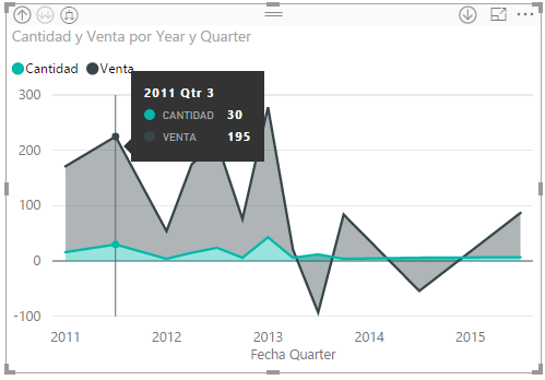 En este caso, como se aprecia en ambas figuras, los gráficos de línea y área están compuestos de puntos que se enlazan y cada punto corresponde con el Año, el trimestre, que es el siguiente nivel de jerarquía y además, en cada caso la Cantidad o las Ventas.
