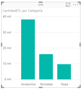 El gráfico de columnas agrupadas, que es el predeterminado muestra el valor agregado, suma como predeterminado, de los datos almacenados en la columna CantidadETL, filtrado o segmentado para cada una de las tres categorías existentes.