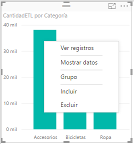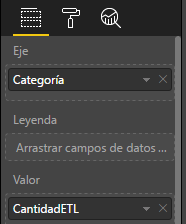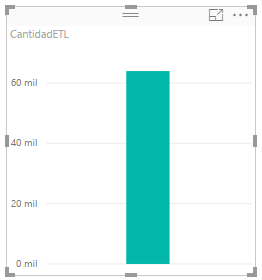 El gráfico de columnas agrupadas, que es el predeterminado muestra el valor agregado, suma como predeterminado, de los datos almacenados en la columna CantidadETL, filtrado o segmentado para cada una de las tres categorías existentes.