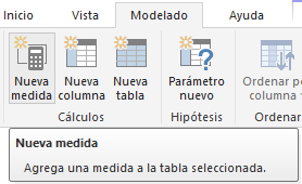 - Seleccionar el botón Nueva medida de la ficha Modelado del menú de Power BI Desktop.