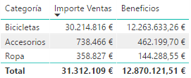Una vez creadas las columnas, el siguiente paso es utilizarlas en una visualización, en nuestro caso será una sencilla tabla. Vamos a analizar el resultado de estas tres expresiones según sea la categoría de los productos vendidos.