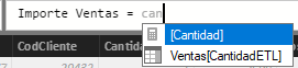En la Barra de fórmulas, vamos a contar con la inestimable ayuda de IntelliSense, igual que en el caso de las medidas. Escribir la expresión Importe Ventas = Cantidad * Precio, es tan sencillo como seleccionar las columnas con el Intellisense.