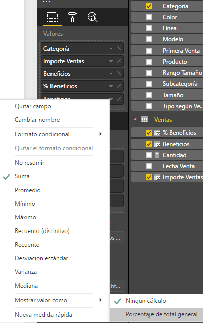 ¿Te haces una idea de lo que ha ocurrido? Pues lo que ha ocurrido es que la columna calculada, a efectos de uso en un informe, se comporta como una columna nativa y al añadirla al informe crea una medida implícita, agregando los valores, sumándolos, como mismo vismos al analizar Medidas implícitas vs Explícitas. Está sumando los Porcientos de Beneficios obtenidos fila a fila en lugar de devolver el Porciento que representan los Beneficios sobre las Ventas.
