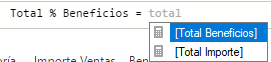 Total % Beneficios = DIVIDE([Total Beneficios];[Total Importe])
