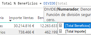 Total % Beneficios = DIVIDE([Total Beneficios];[Total Importe])